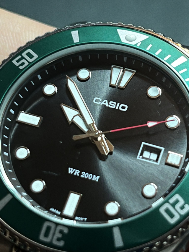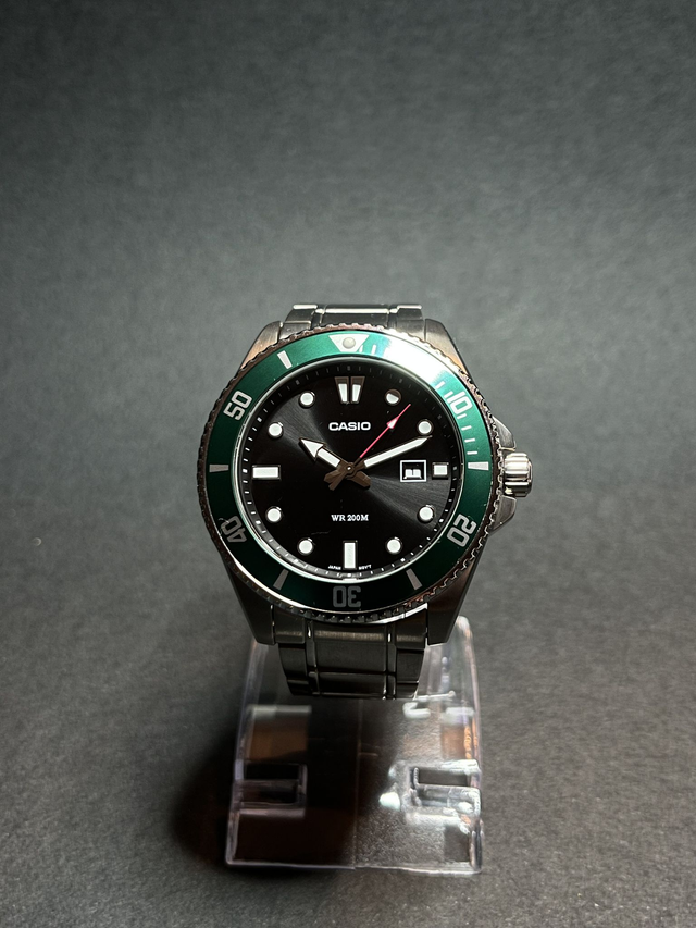 Known as the "Duro" among watch enthusiasts, this watch combines the rugged reliability of a professional diver with a modern and stylish look thanks to a striking black sunburst dial and emerald green bezel.