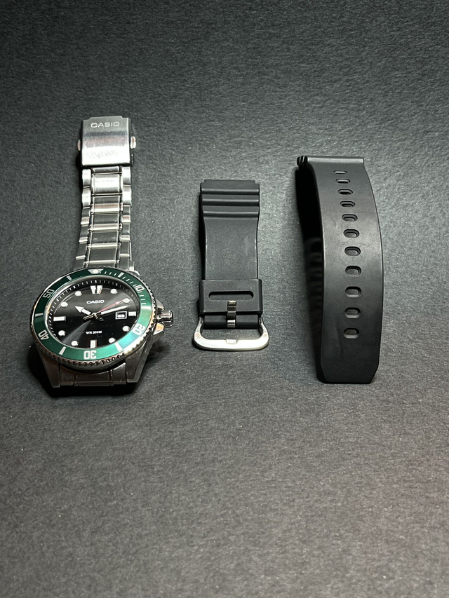 While this model comes on a brushed stainless-steel bracelet, an original Casio resin strap is also included for variation.